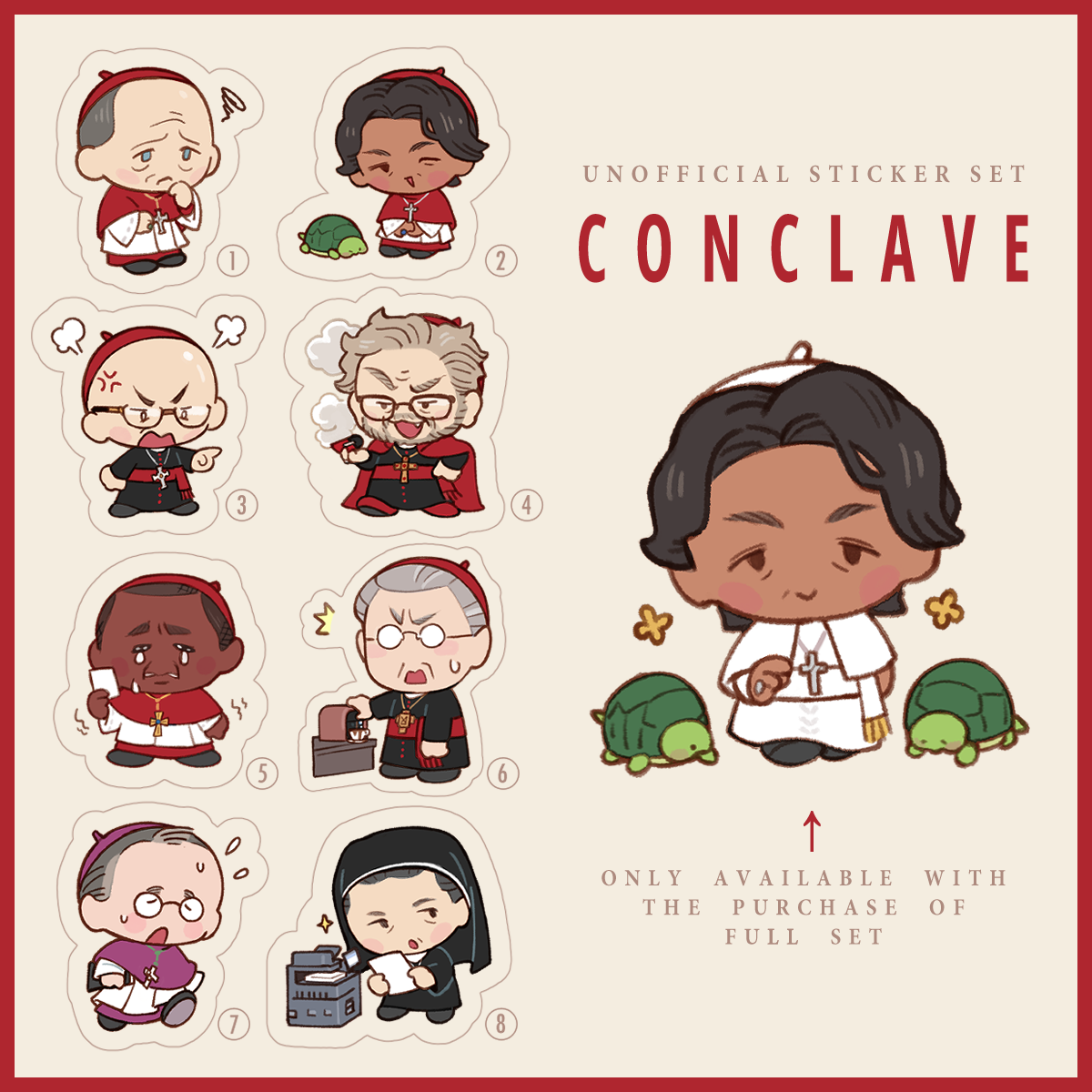Unofficial diecut, frosted sticker set based on Conclave (2024). You may purchase them individually.